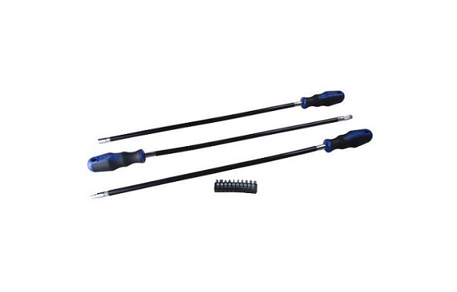 US Pro Extra Long Flexi Screwdriver & Bit Set. 1 x Flexible Driver with 7mm socket end. 1 x Flexible Driver with bit adaptor end. 1 x Flexible Driver with 1/4″ drive end. Bits: Torx: T10, T15, T20, T25, T27 & T30. Flat Bits: 5.5 & 6.5mm. Phillips Head: PH1 & PH2.
